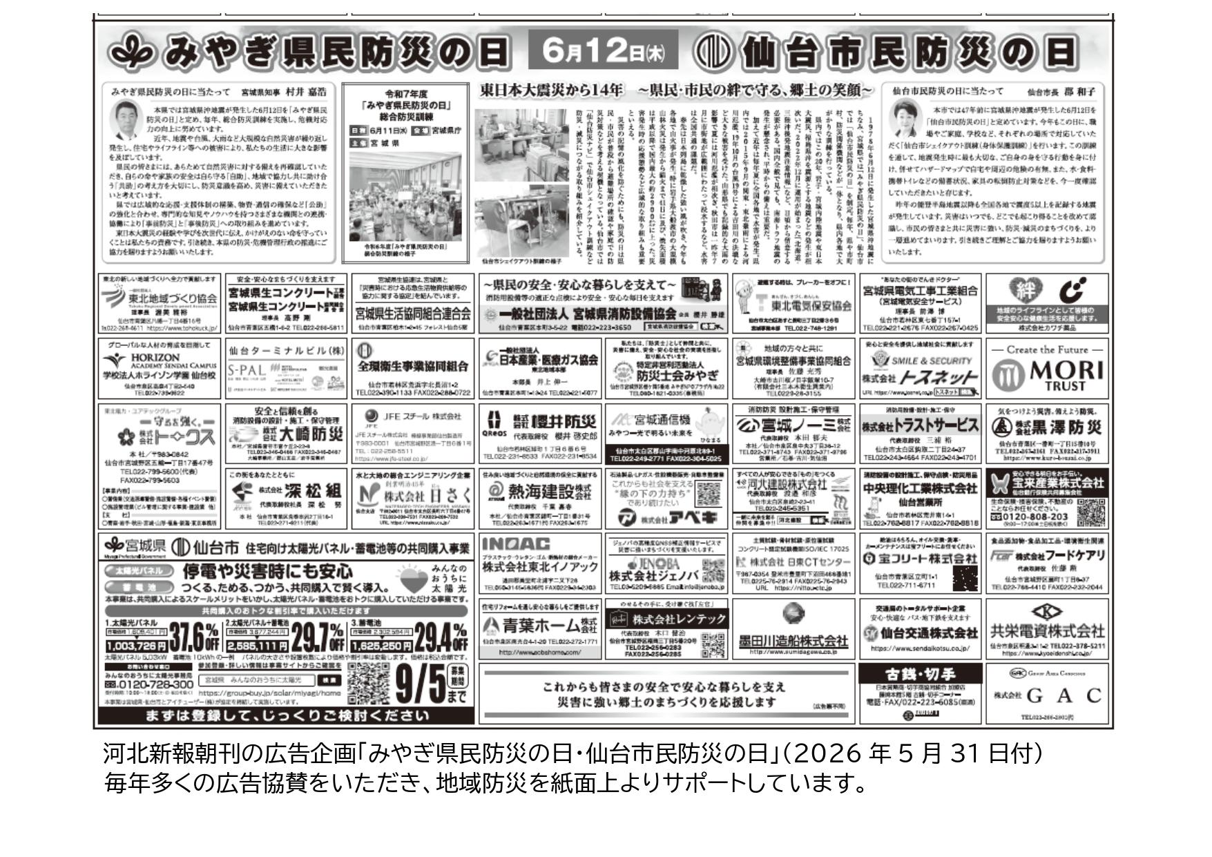 2022年に創刊125周年を迎えた「河北新報」は、東北6県に朝刊約38万部を発行するブロック紙で、特に宮城県では世帯普及率約36%と高い支持を得ています。私たちは河北新報社の契約広告代理店として、「河北新報」や発行情報誌「河北ウィークリーせんだい」において、宮城の自治体や業界団体、企業のPR活動や広報活動を広告企画でサポートしています。