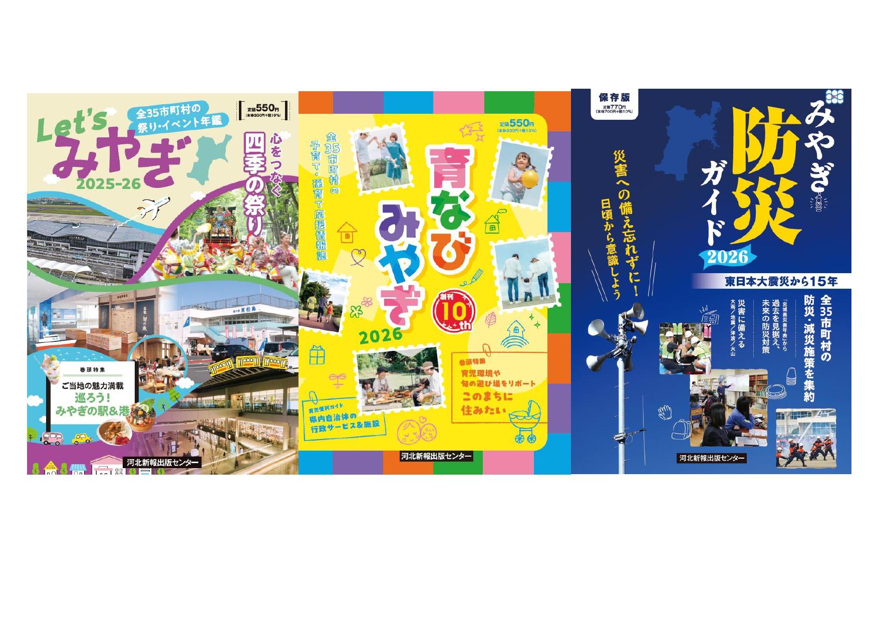 郷土の祭り・イベント年鑑「LET’Sみやぎ」、次の災害に備えるために安全・安心をサポートする「みやぎ防災ガイド」、子育て世帯を応援する「育なびみやぎ」を全て企画構成し、河北新報出版センターより発行しています。