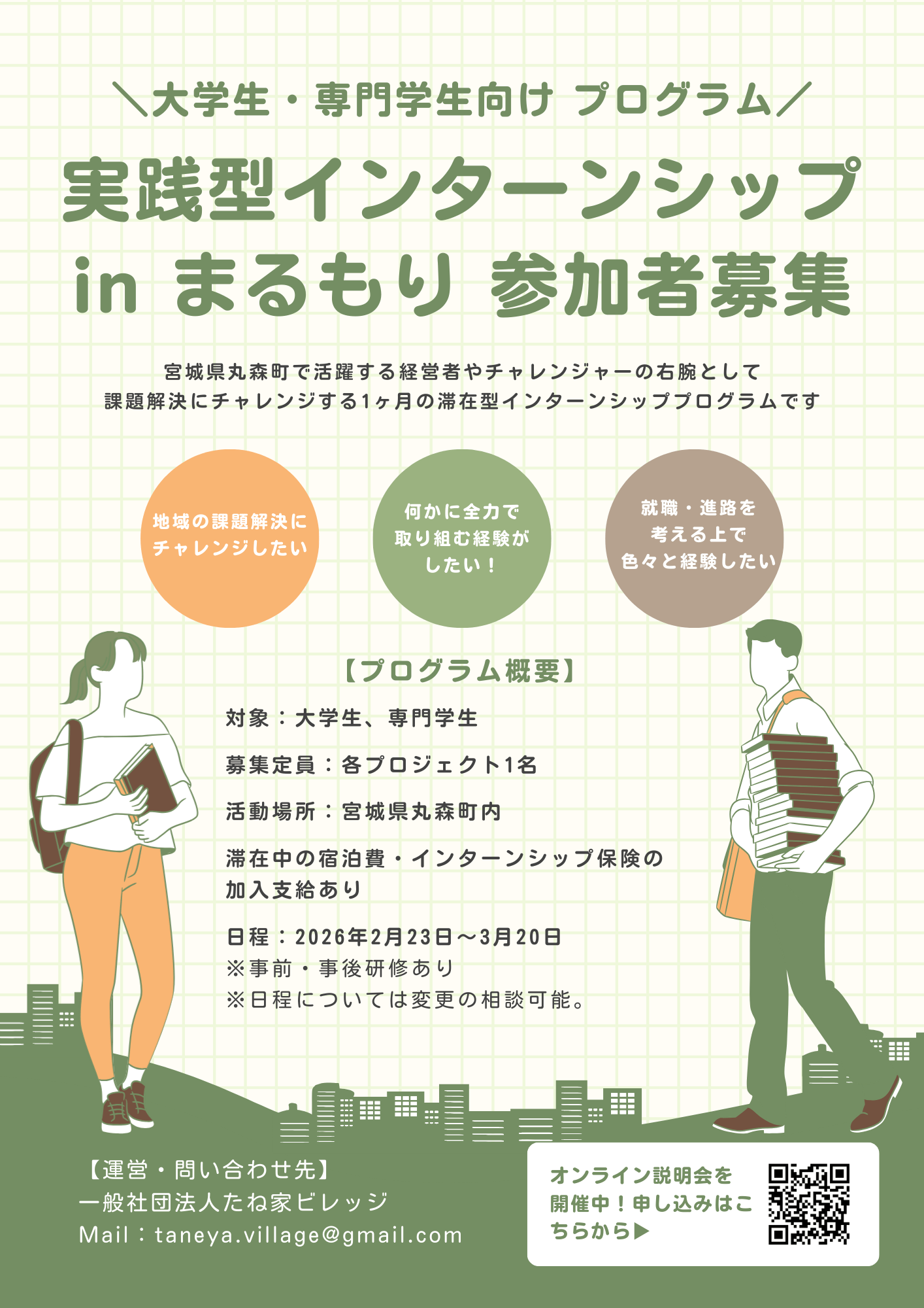 令和7年10月から丸森町地域おこし協力隊として活動している岩本華奈さんが実施するイベントをご紹介します。岩本さんは、一般社団法人たね家ビレッジを活動拠点とし、若者が地域づくりに携われる機会の創出に取り組んでいます。