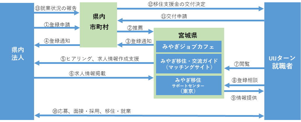 ⑧⑨⑩ UIJターン求職者は「みやぎ移住・交流ガイド」に掲載された求人を閲覧し、募集法人に直接応募します。下記参考に記載された支給対象要件に合致した求職者の採用を内定した際は、「移住支援金」を受給できる可能性がある旨ご説明ください。