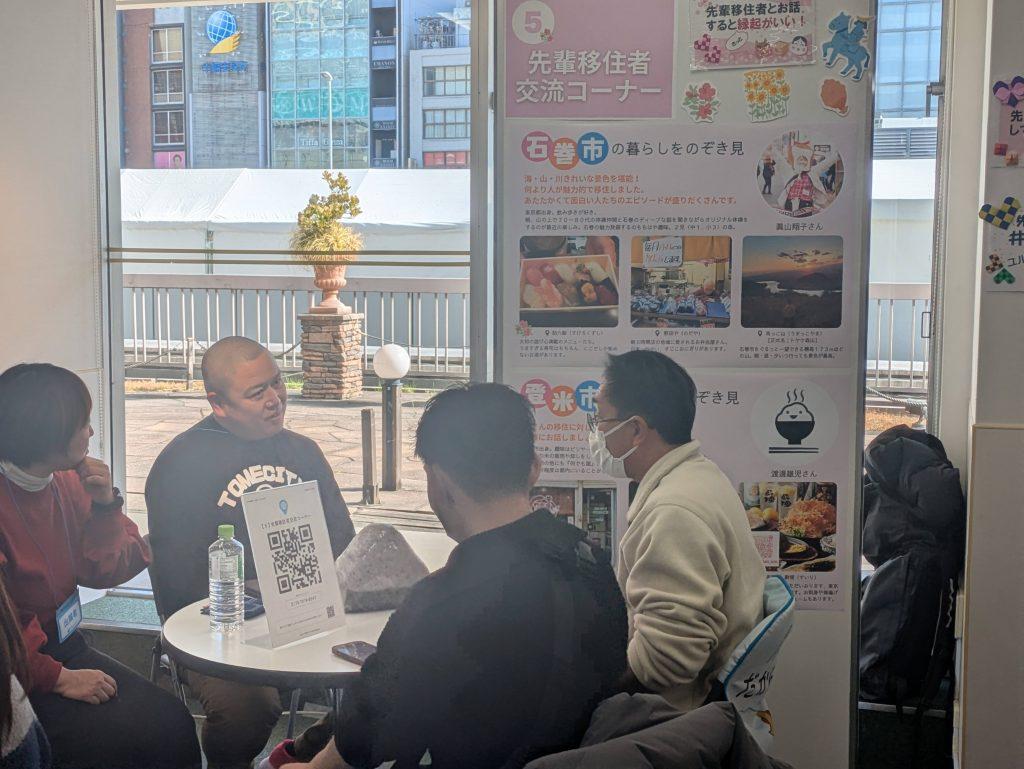 登米市出身/在住(U-ターン)の渡邊さんと気軽にお話できる交流コーナーを設置しました。